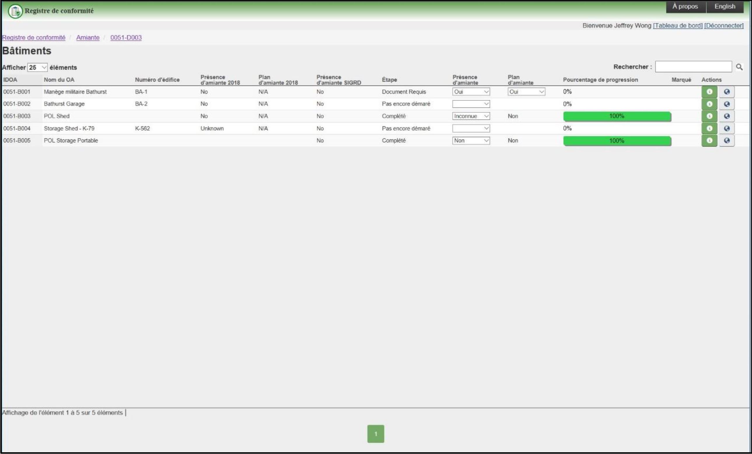 L’inventaire actuel des bâtiments du MDN contenant de l’amiante est disponible sur Canada.ca. L’outil de conformité est mis à niveau chaque année en novembre en préparation à la collecte de données et à la certification de l’exhaustivité et de l’exactitude de celles-ci, qui se déroulent de janvier à avril.